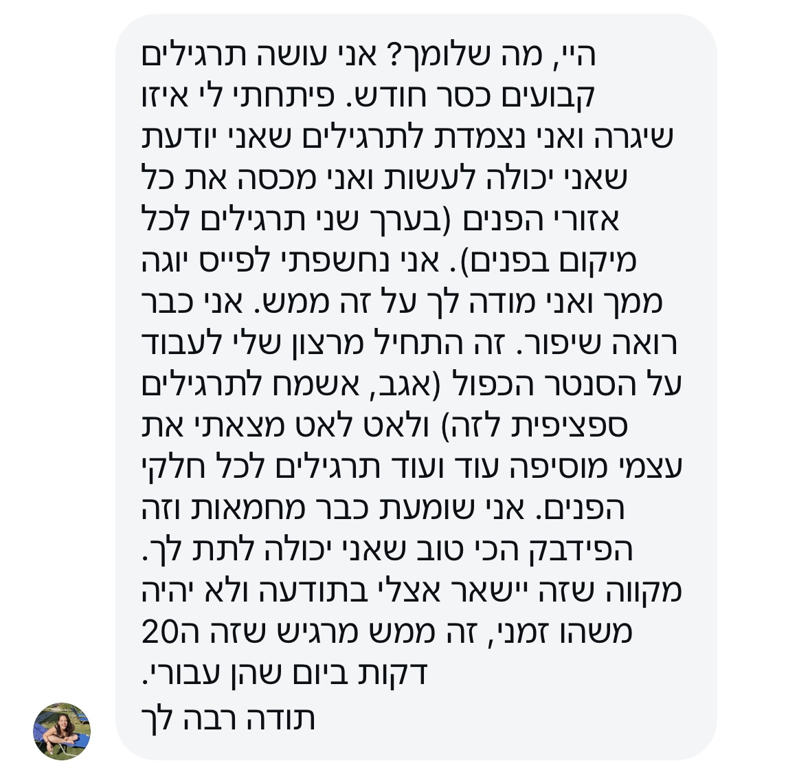 אחרי שלמדת את הטכניקה, הכרת את התרגילים והתמקדת באזור שרצית לראות בו שינויים, יצרתי עבורך רוטינה אחת מדויקת, קצרה ונעימה – שמאגדת את התרגילים הכי חזקים מכל שלושת השיעורים לכל אזורי הפנים.